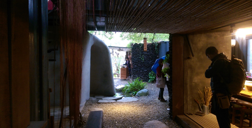 在這裡貨櫃被裝飾得如重生一般,一個遮風避雨的原始價值、簡單而不矯情的商業空間。店面門一打開就成了的竹編小屋頂,卻仍是讓植物的氣根穿縮在其中,雖然那天下著雨卻完全不會困擾著我。而這小屋頂更強化了路徑連接了每一個店鋪變成了小市集,或是說聚落也不為過。回想起對氣根的記憶,國小家長接送旁等家人食一直偷偷拔它的大榕樹,土地公廟前被包覆小角的鐵板凳,能被當成建築元素一起討論的大概就是吳錫山的氣根窗簾的那張照片了吧。這時才突然驚覺原來我也曾經算是半個鄉下小孩,又多久沒回田埂間跑跑跳跳了。