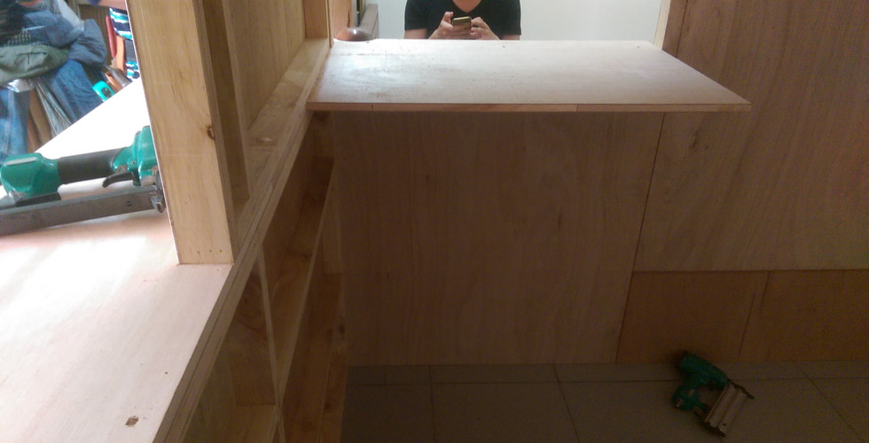 為了能打破270×270的限制,兩面新增的牆面可以做一些嘗試。努力試著創造一些開口去與外部空間作連接,卻又不失私密性和房間的使用性。同時空間內有要有書房與睡房與娛樂空間,就算如此270×270的室內應該有的機能樣樣都沒有減少,可謂麻雀雖小五臟俱全。並不讓工作空間像是在面壁思過的角落反省,重新定義了現代人對於書桌的關係。調整了書桌的高度與尺寸讓卻不失其領域感的完整性。而延伸出去的展示架連接著書桌,更串連了這兩扇窗戶的內外性。內外牆面的顏色也是異曲同工之妙,希望能體驗其對比。原本業主的家具和床也是原封不動的再次使用,也沒有刻意的淘汰更換。 整個過程也是第一次從頭開始與木工師父或是一些細部構建的討論。都是超級難得的經驗,從與業主修正設計到和木工師父確定成施工圖,過程實在經歷了太多的洗禮。也好不容易才畫成了彼此能溝通的與通俗的材料尺寸。唯有配合通俗材料的尺寸才能控制好成本,這也是成長路上要努力去學習的! 雖然預算方面的掌握還是胡亂的可怕,為了省錢,又不願意用半加工材的美化板,最後用了二分夾板然後業主自己粉刷批土的牆面,然而無法控制拼命趕工的業主,也粉刷出了一道屬於他自己的牆面,很多想像的細節也在材料本身的特性下漸漸凋零,不知道為何總是讓我想起Jean Nouvel 在ELcroquis作品集-巴黎愛樂音樂廳附上滿滿兩頁的施工缺失的瘋狂舉動。但因為如此或許也是最有感情屬於自己的房間了。 而原本想像中的玻璃窗開口與訂做的滑軌窗去議價後的金額更是完全超出我們的預算,訂做的窗戶更是貴到嚇死人了。只好自己接洽小工廠幫忙,最後則是找了一家願意幫忙訂做壓克力的工廠一口氣克服了預算、載重、自行施工的問題。可說是台灣人最實在的精神之一了,然後在中壢詢問這些小工廠等根本就是在中原的地盤上撒野阿。 最後還是非常謝謝業主給予的信任與放手一搏的機會,過程中也因為業主時不時的出國與我在部隊裡的留守,拖了好長一段時間才全部正式完工。真的是蠻懷感激的謝謝學長,希望他也能享受的新的小房間。